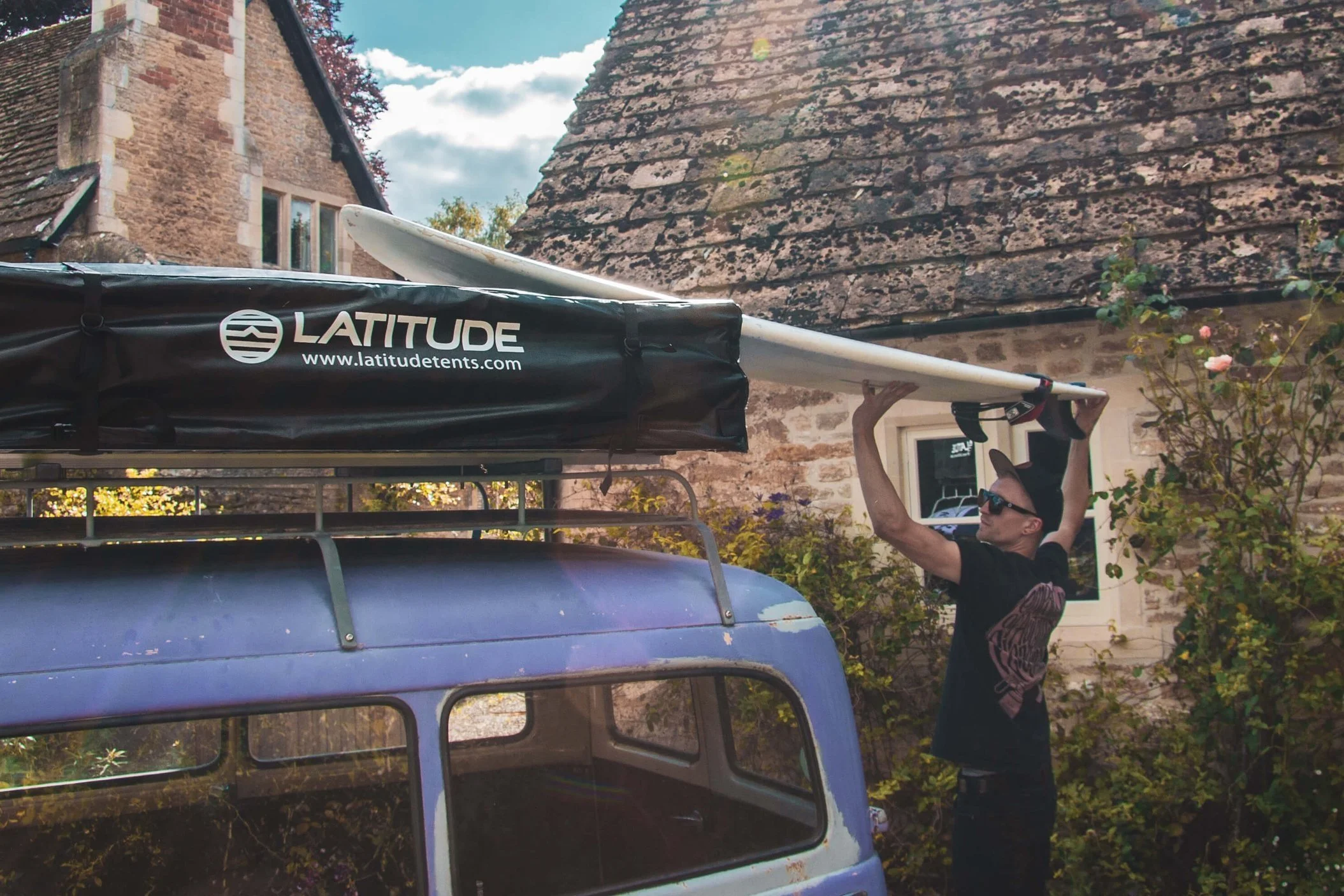 A little while ago, in the peak of summer, we took a trip over to Latitude family member Jake’s to check out his set-up after he told us he’d been putting his surfboard on top of his roof tent.